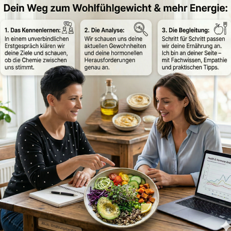 In meinem Coaching begleite ich dich dabei, die Signale deines Körpers neu zu deuten und eine Ernährung zu finden, die dich in dieser Phase unterstützt, statt dich zu stressen.